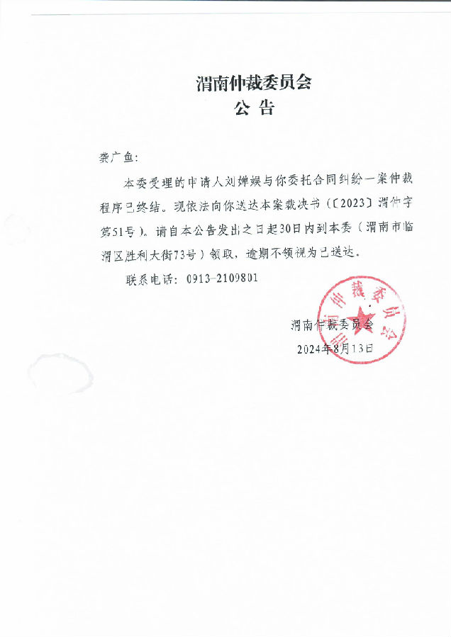 龔廣魚與劉嬋娛委托合同糾紛案公告